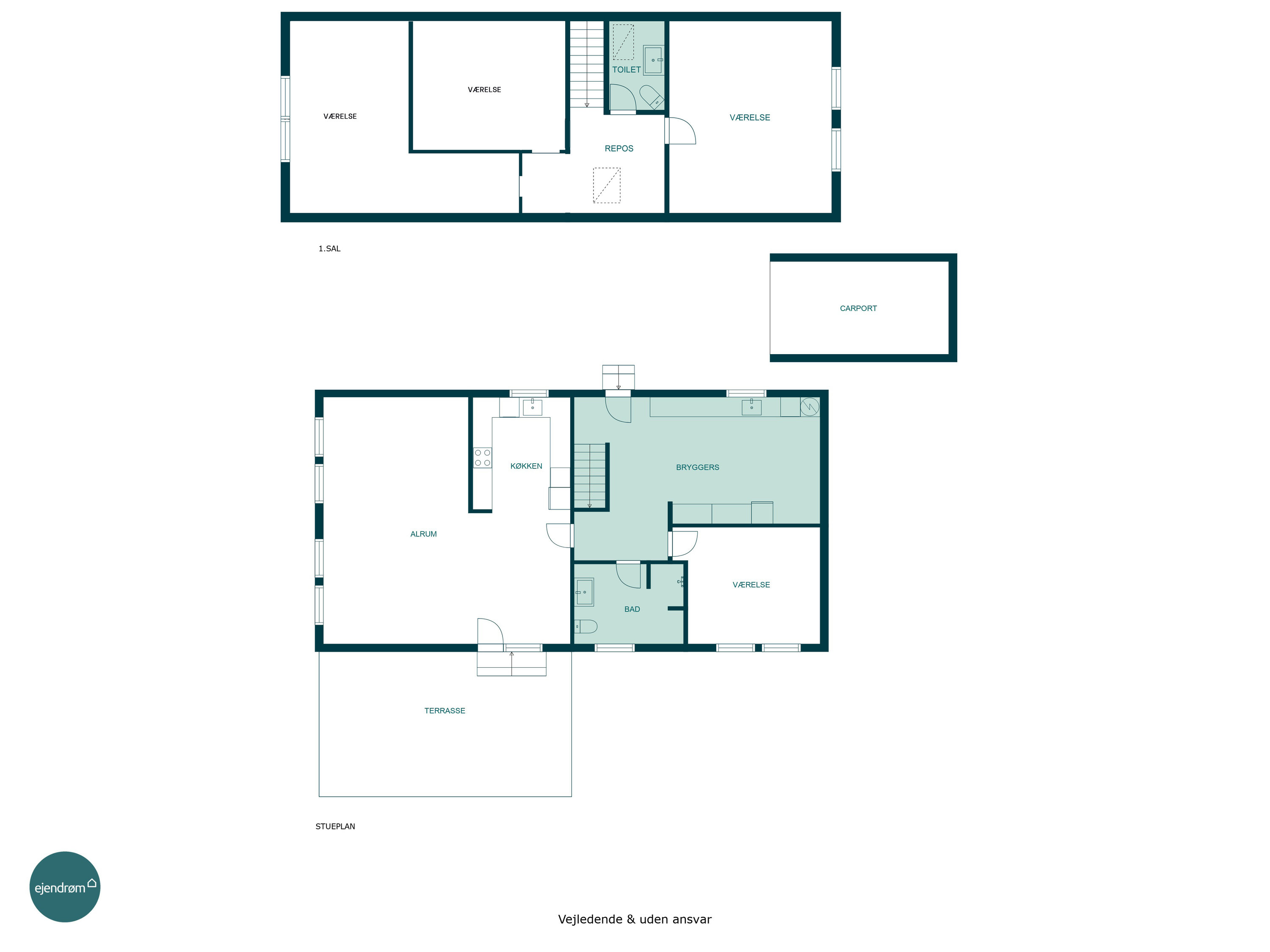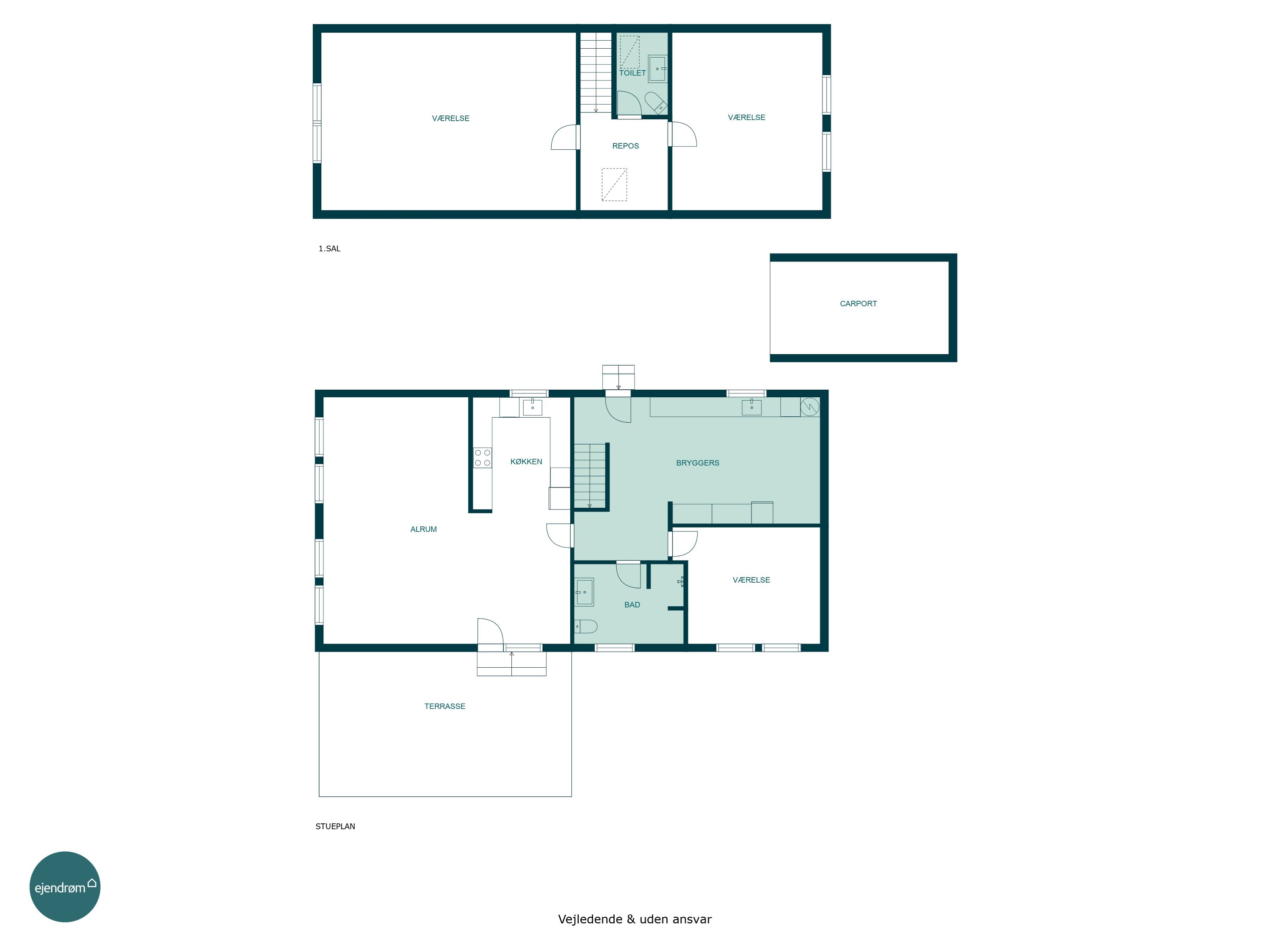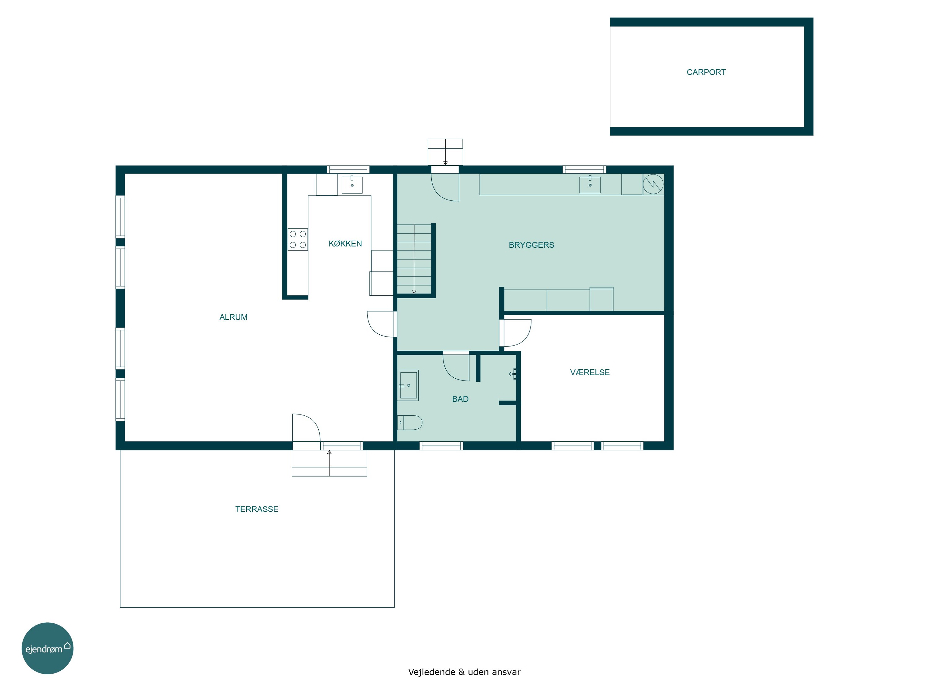Boligen er indrettet med fokus på familielivet og hverdagen. Fra entréen føres du direkte ind i det store bryggers, hvor der er masser af opbevaringsplads og god plads til hverdagens praktiske gøremål. Herfra er der også adgang til husets badeværelse, et værelse samt trappeopgangen til 1. salen. Hjerterummet i boligen er det åbne køkken/alrum, hvor de lyse elementer og den åbne planløsning inviterer til samvær. I åben forbindelse til køkkenet finder du stuen, som er både lys, rummelig og let at indrette med både spiseafdeling og sofaområde.