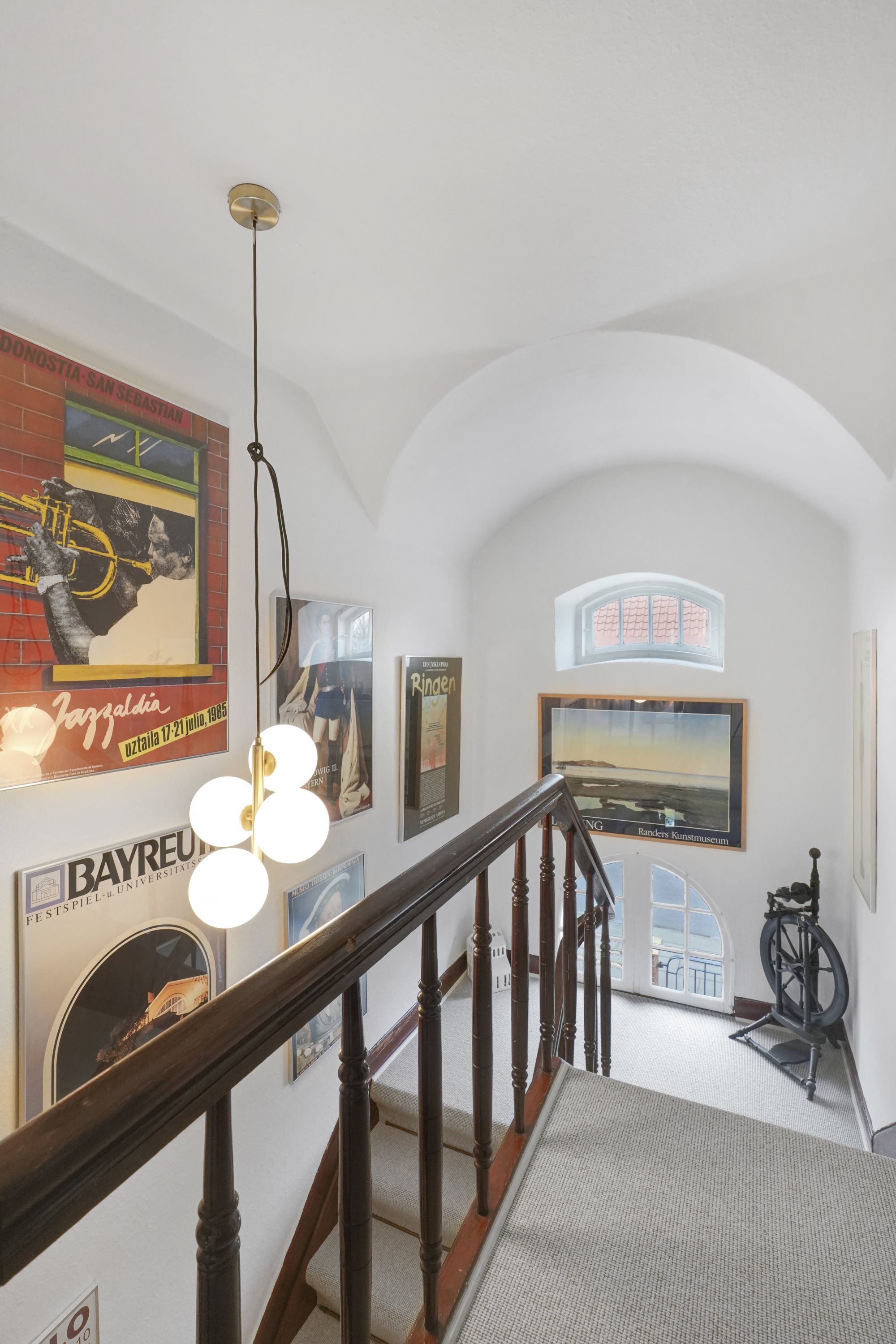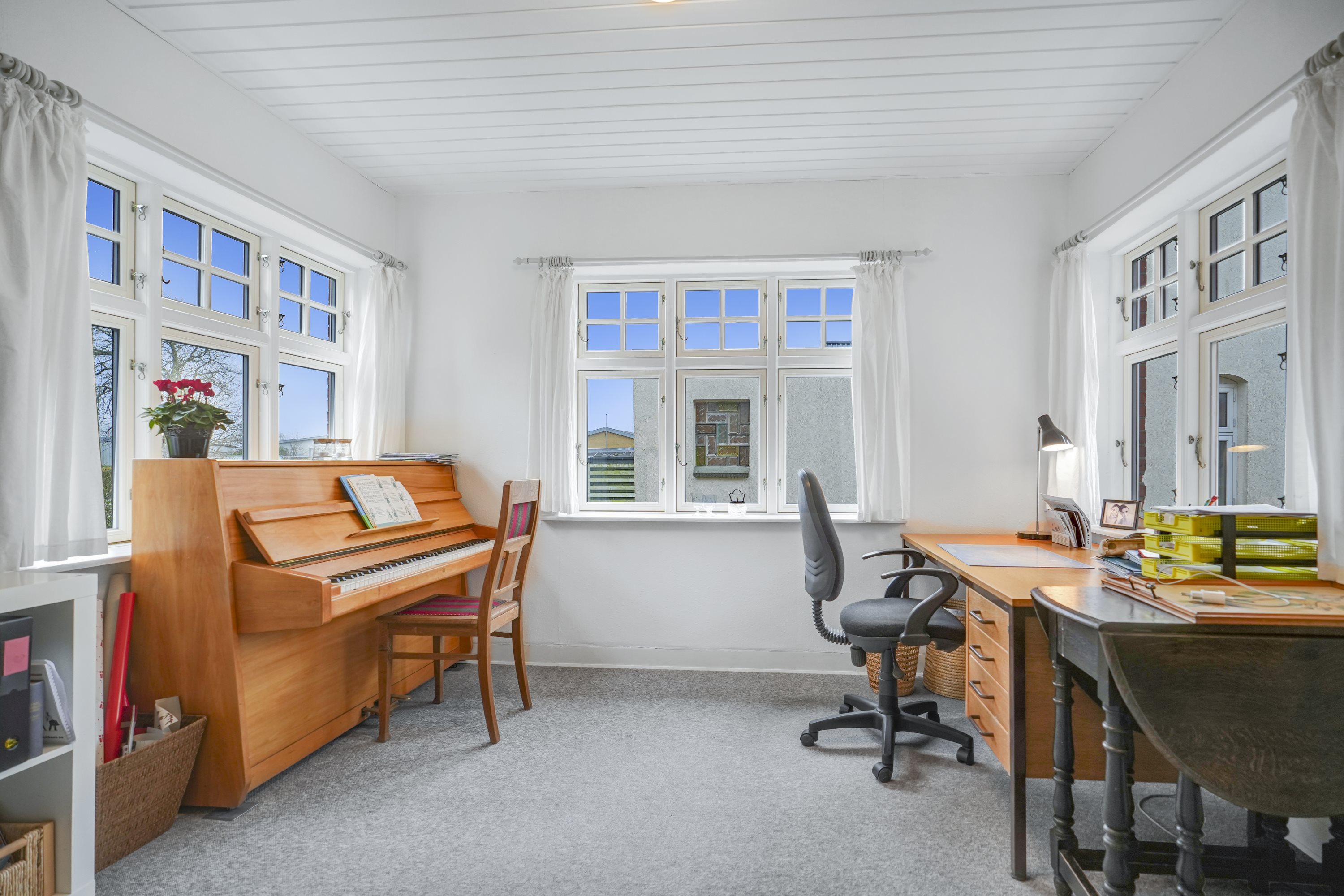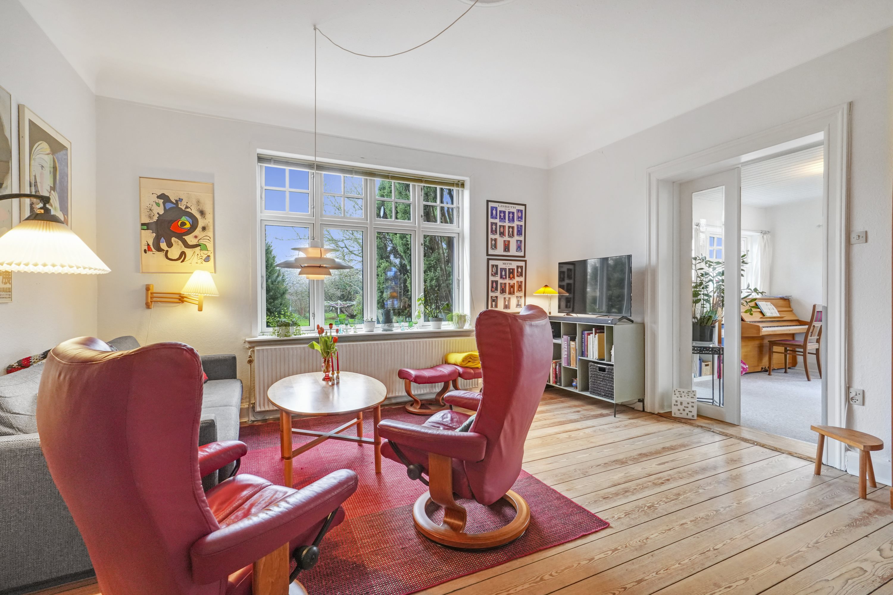 På første sal mødes du af en mere privat del af boligen, der består af hele fire værelser – heraf et stort soveværelse og flere anvendelige rum, der kan benyttes som børneværelser, kontor eller gæsteværelser. Et rummeligt badeværelse samt en fordelingsgang binder etagen sammen.