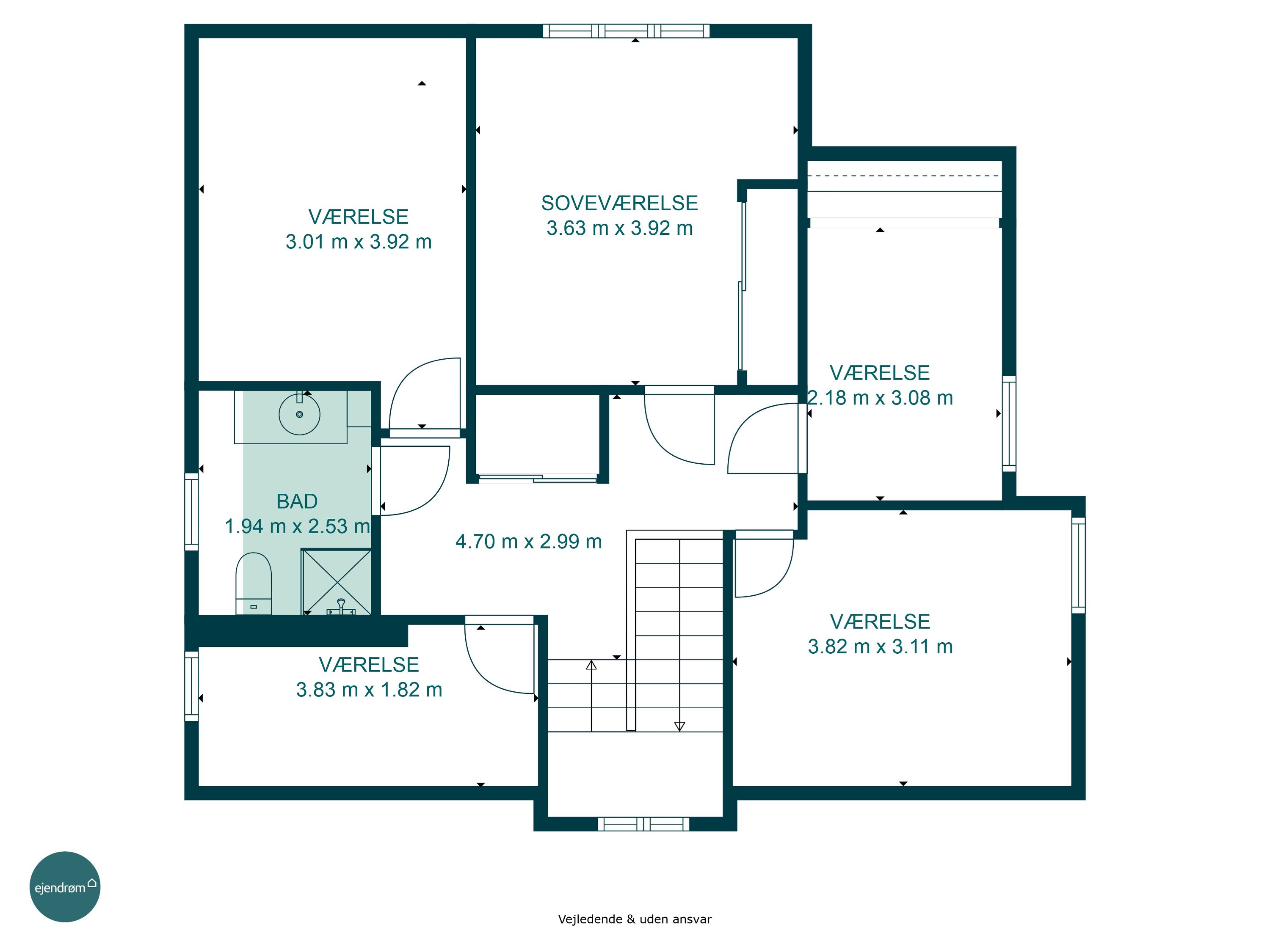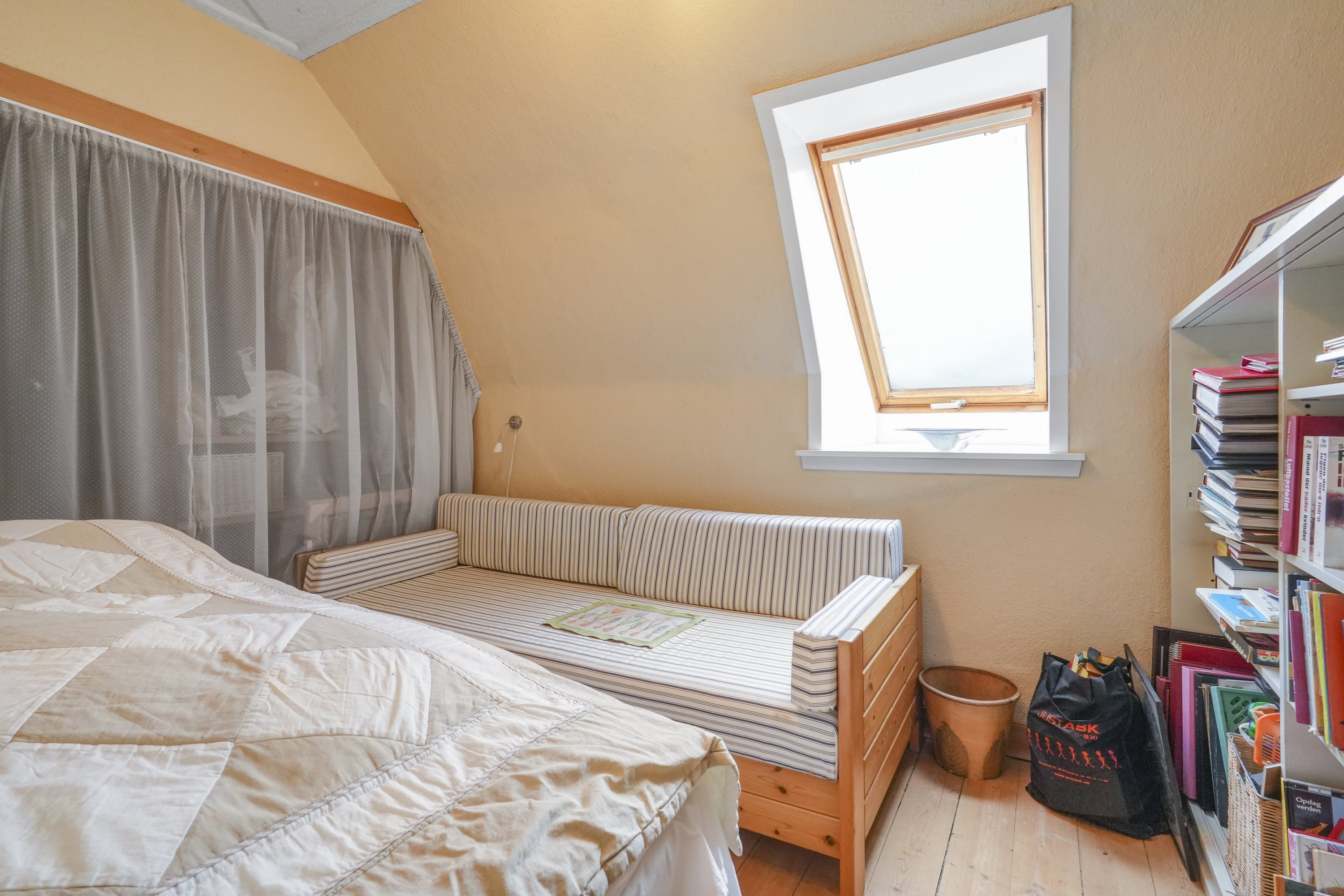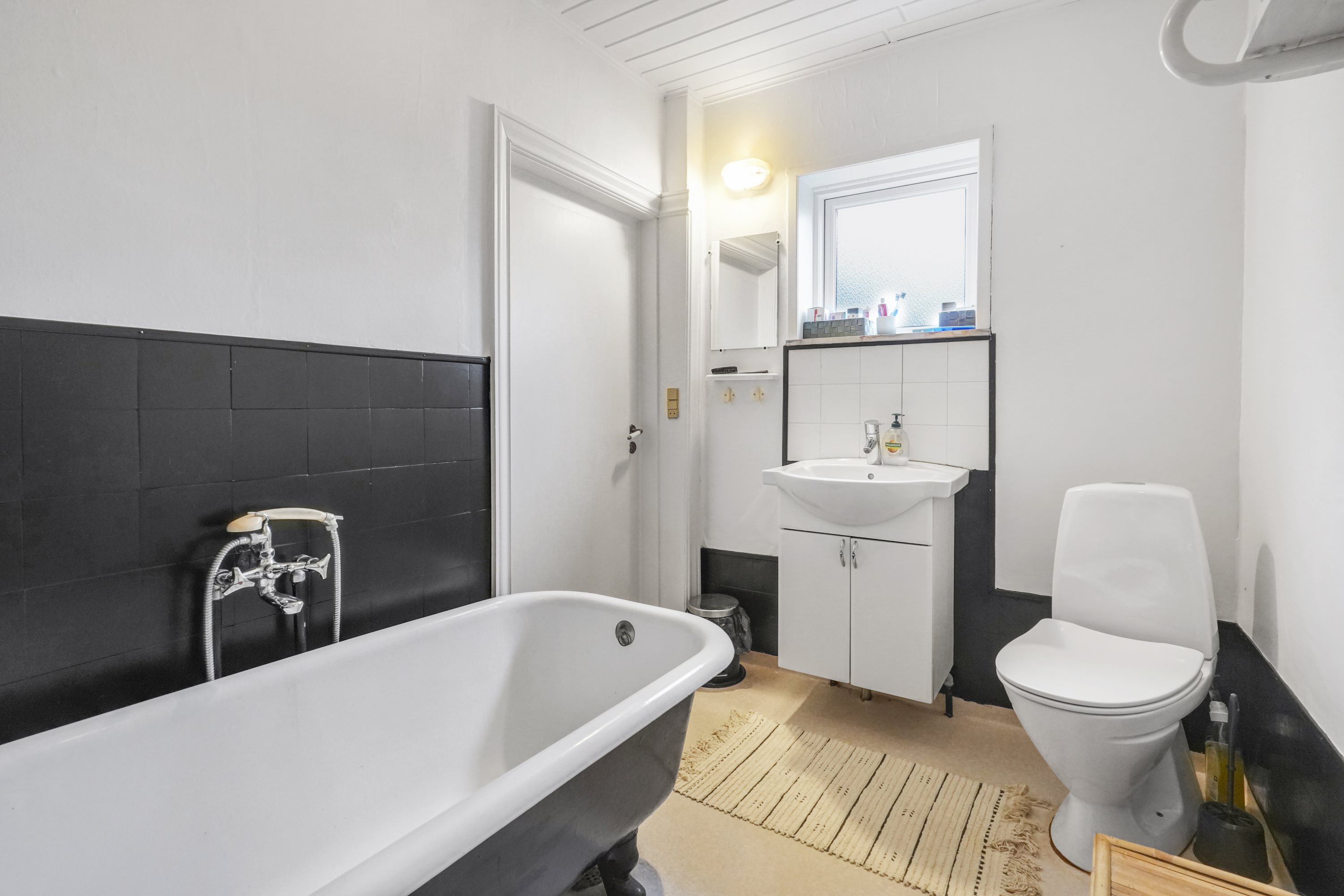 På første sal mødes du af en mere privat del af boligen, der består af hele fire værelser – heraf et stort soveværelse og flere anvendelige rum, der kan benyttes som børneværelser, kontor eller gæsteværelser. Et rummeligt badeværelse samt en fordelingsgang binder etagen sammen.