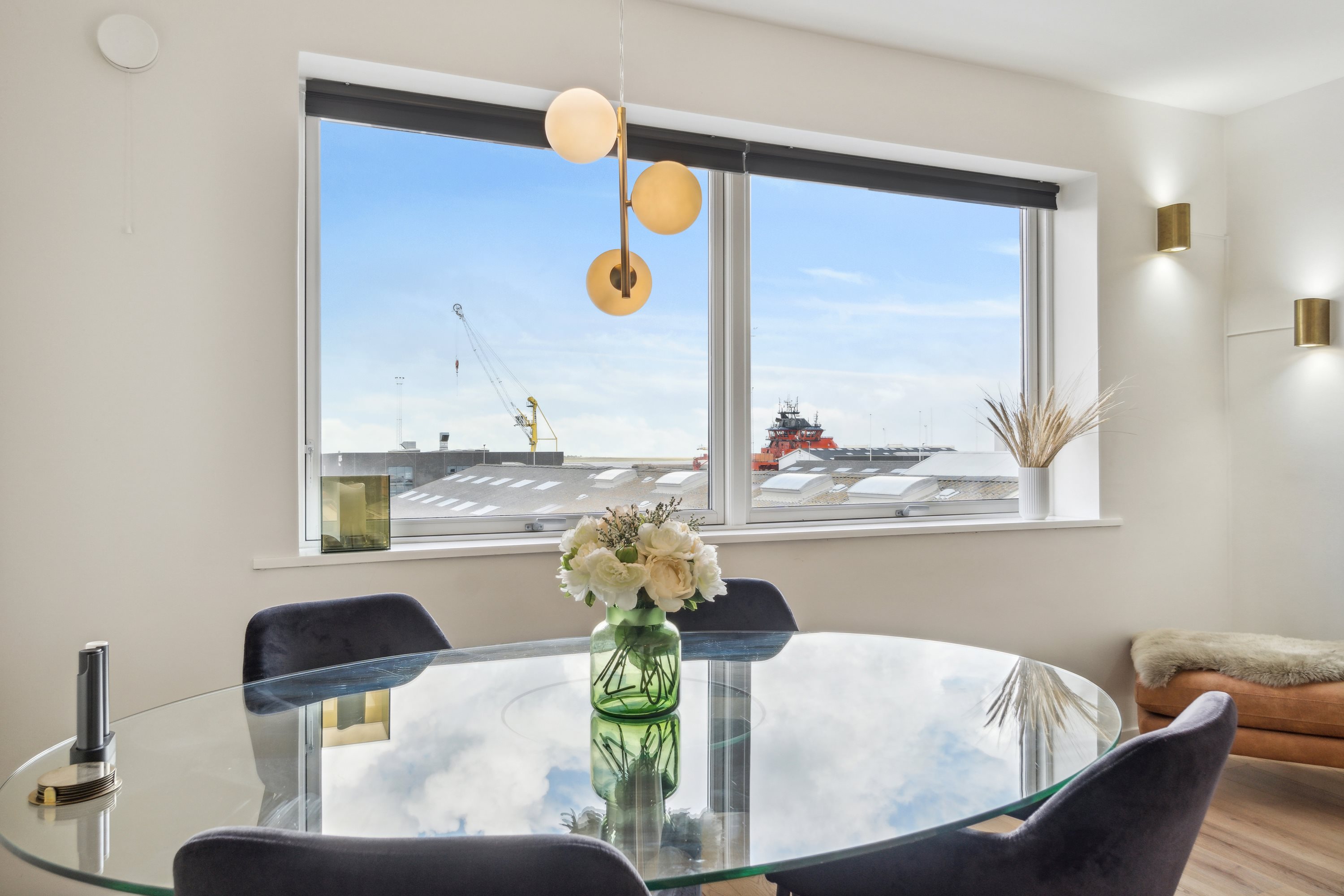 Udtrykket her, er fantastisk og det her er en lejlighed som SKAL opleves. Den har et overdådigt lysindfald fra de store vinduespartier, der i øvrigt giver havne- og havudsigt samt udkig til indsejlingen + Fanø/Nordby. Denne udsigt kan nydes fra stuen eller fra den fine altan.