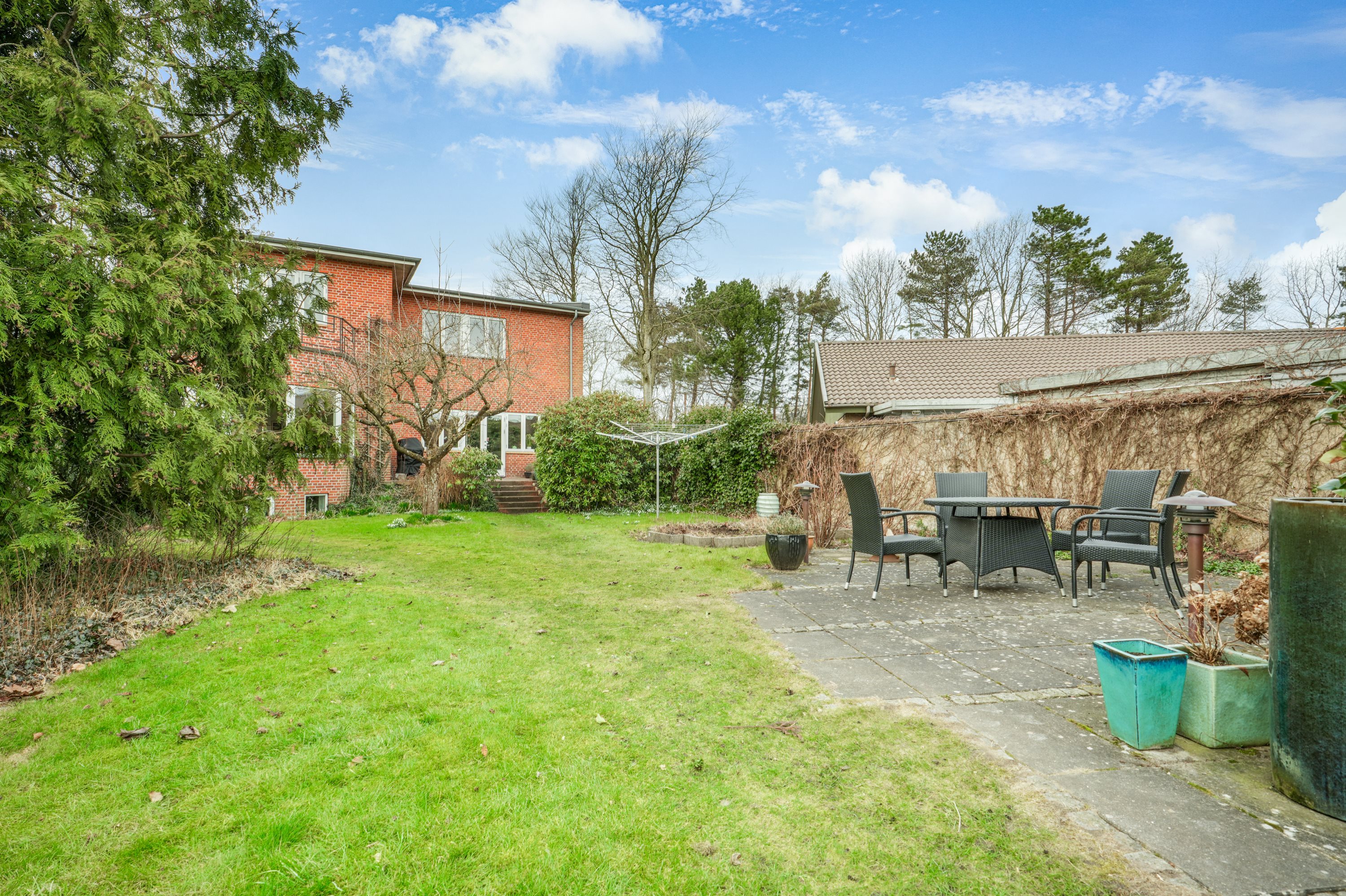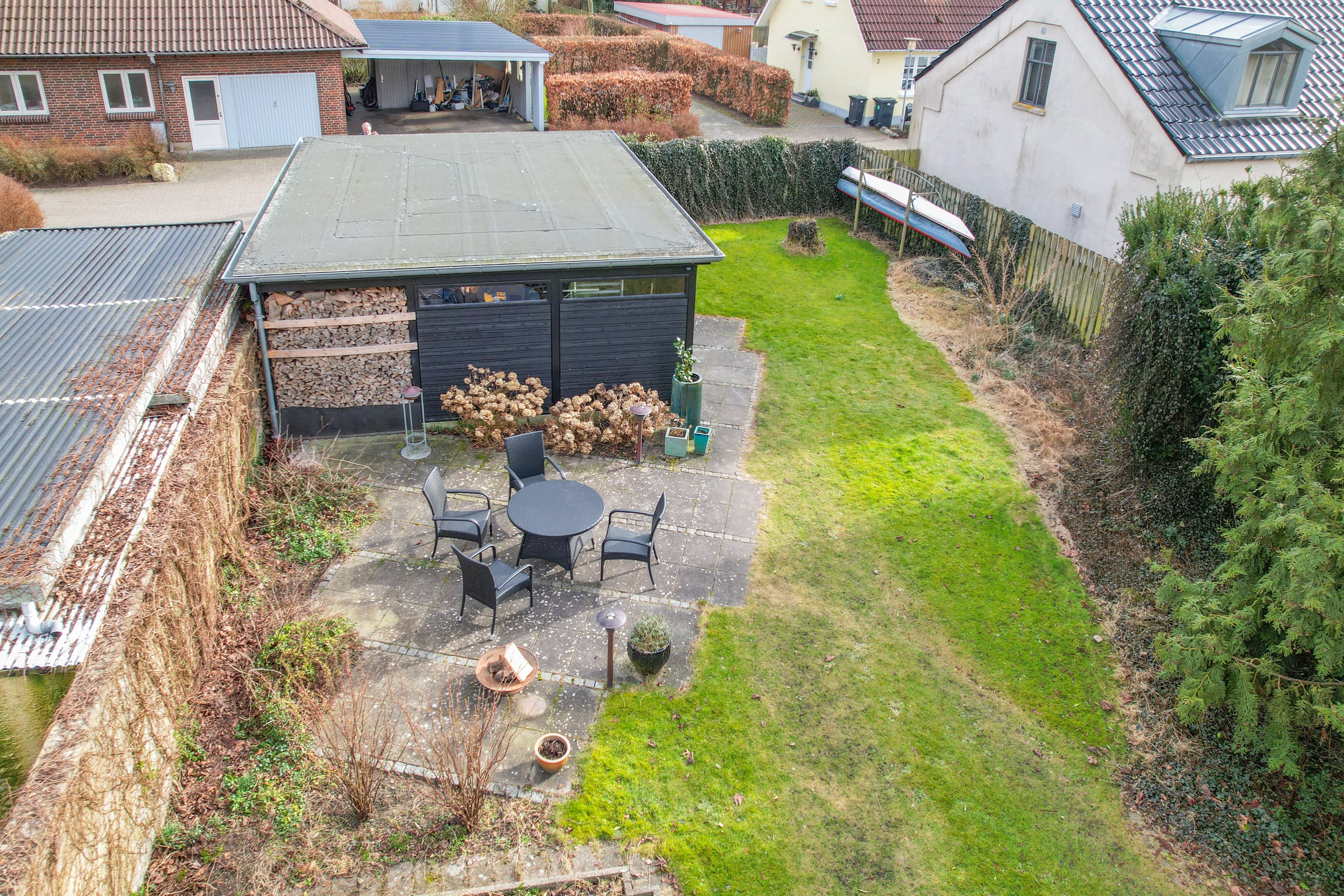 Udendørs venter en hyggelig have med flere solrige terrasser, hvor du kan nyde lange sommeraftener i skønne omgivelser. Den private og velanlagte have er skabt til både afslapning og udeliv. Tilhørende villaen er der dobbelt carport med isoleret værksted.