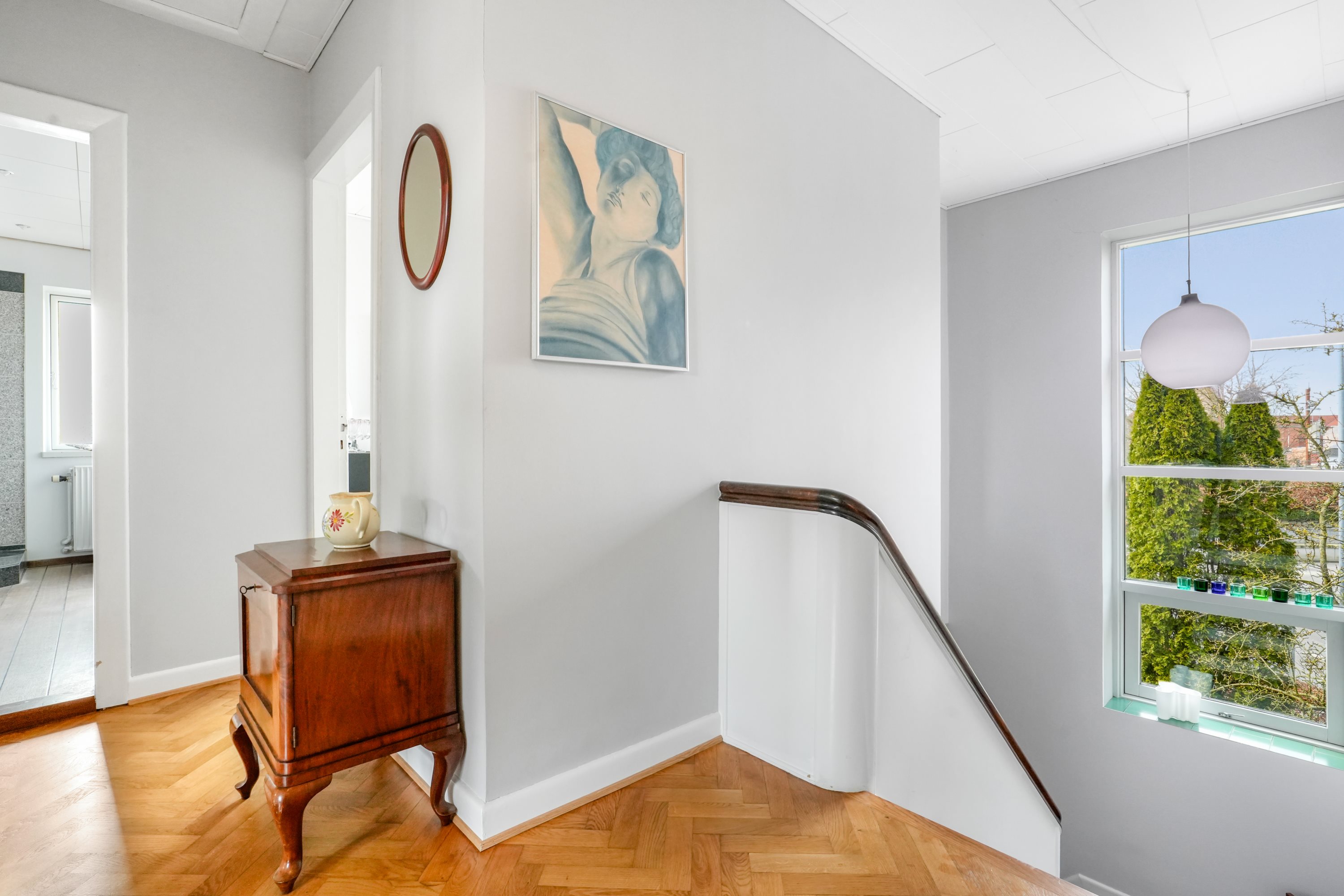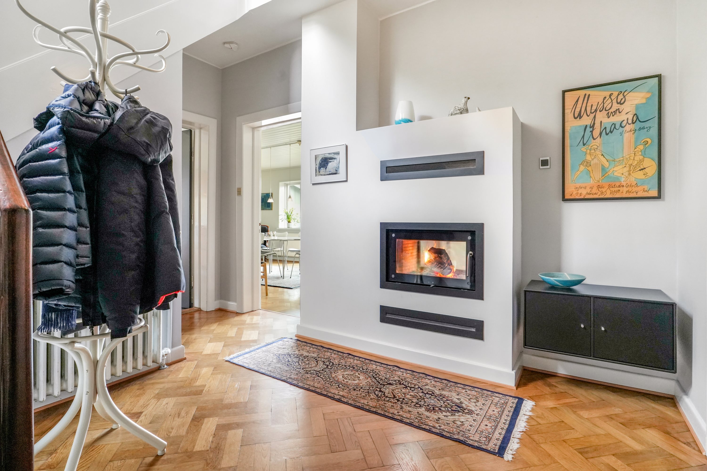 Fra det øjeblik, du træder indenfor i villaens hall, mødes du af et smukt lysindfald fra de store vinduespartier, der er karakteristiske for funkisstilen. Ydermere er der i hall’en en gennemgående pejseindsats, som sikrer stemning og varme til hele hjemmet. Villaens planløsning er gennemtænkt og giver en naturlig sammenhæng mellem rummene, mens de originale detaljer og rene linjer understreger husets arkitektoniske værdi.
